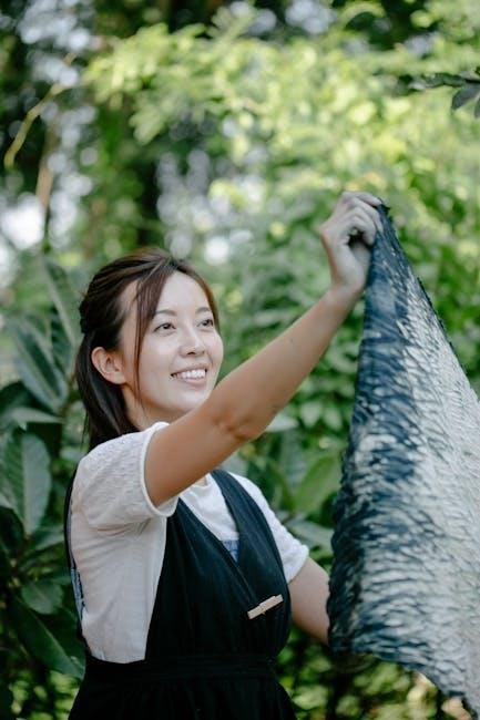Rubber bands are indispensable for creating the resist patterns detailed in your printable PDF guides – spirals‚ bullseyes‚ and stripes all rely on secure binding. Gloves are non-negotiable‚ protecting your hands from dye staining. A plastic drop cloth or covering safeguards your work surface from accidental spills. Finally‚ plastic bags or wrap are needed for allowing the dye to set properly‚ often requiring 6-8 hours or even overnight.